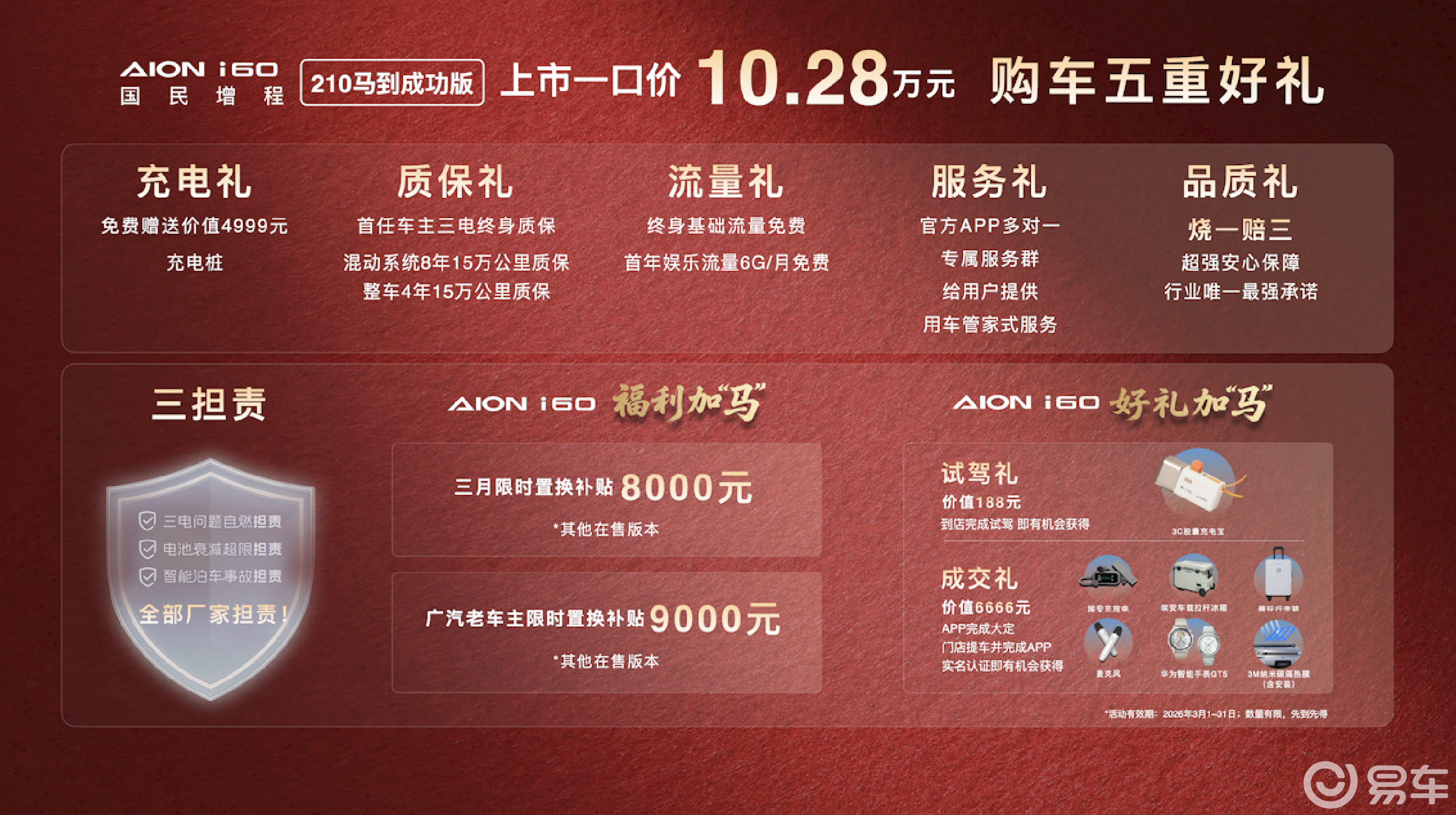 3月限时补贴,老车主置换9000元官方推出3月限时置换补贴:i60其他在售版本置换补贴8000元,广汽老车主置换补贴9000元。即日起至3月31日,到店试驾有机会获得价值188元好物,下定还能抽6666元专属礼包。